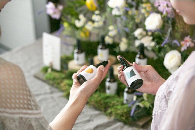 植物の天然成分から抽出された香料だけで生み出された香りのスプレー。新郎新婦の登場を待つゲストが好きな香りを纏うことで、入場シーンはより印象的で思い出深いものに。開発期間は約1年。UNO DESIGN代表の宇野プロデュースのもと、MEGUMI FUKATSU氏(A Green Inc.)により生み出されました。