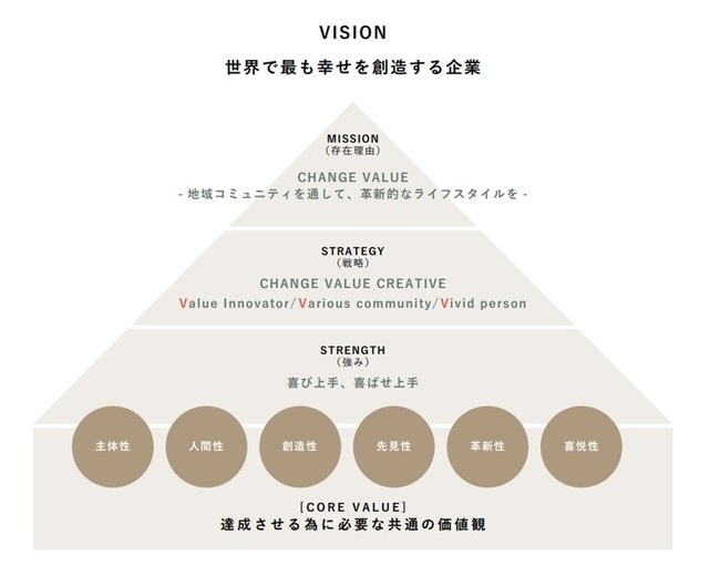 ビジョンとして掲げる「世界で最も幸せを創造する企業」を達成するために、地域コミュニティを通して、誰も見たことのない革新的なライフスタイルを提供していきます。