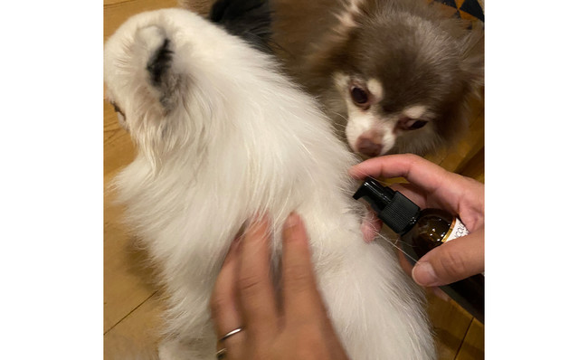 「愛犬が3歳の頃、突然足先を噛むようになり、肌に問題があるとわかりました。なんとかしてあげたい、という強い想いからフコロジーエッセンスの開発に着手しました。とにかく何でも舐めるので試作品の段階から「舐めても安心」を大前提とし安心できる成分に拘りました。舐めても保湿力が落ちないよう定着性を高めつつ、粘度は落として毛玉問題を考慮。改良に改良を重ね、ついに完成したのがこのエッセンスです。」