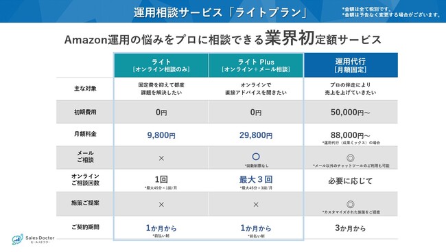 Amazon運用を網羅的に運用支援する、伴走型サービス「セールスドクター」はこれまで200社を超えるお客様にご採用いただいております。多くの悩める事業者様にご利用いただきたいという願いから、業界最短の3か月単位でのご契約が可能です。ご興味ある方、事前相談(無料)を承っております。ウェブサイト(https://salesdoctor-amazon.com/)からお気軽にご相談ください。