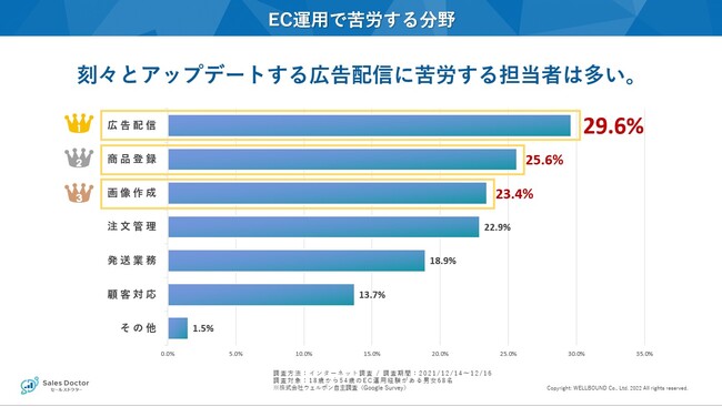 「EC運用で苦労する分野はどこですか?(複数回答可)」と質問したところ、『広告配信(29.6%)』と回答した方が最も多く、次いで『商品登録(25.6%)』『画像作成(23.4%)』と続きました。