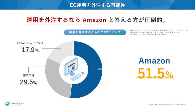 続いて、「EC運用を外注するならどのECサイトですか?」と質問したところ、『Amazon(51.5%)』と回答した方が最も多く、次いで『楽天市場(29.5%)』『Yahoo!ショッピング(17.9%)』と続きました。