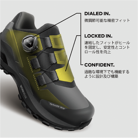 微調節可能な BOA(R) PerformFitTM Wrap 構造は、中足部を包み込んでフィットさせることで安定性、効率性、耐久性を向上させるように設計されており、優れたヒールロック、ミッドソール、前足部の自由度の向上を実現します。