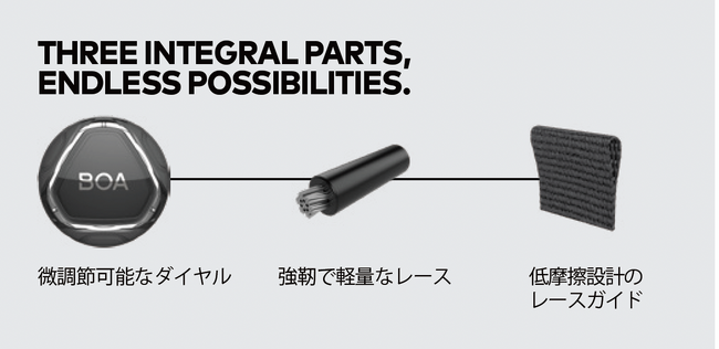 BOA Technology Inc. は、各業界のリーディングブランドと提携し、特許取得済みの BOA(R)フィットシステムを通じて最高のギアを開発、強化しています。パフォーマンスのための専用フィットソリューションを提供する BOA(R)フィットシステムは、スノースポーツ、サイクリング、ハイキング/トレッキング、ゴルフ、ランニング、コートスポーツ、ワークウェア、医療用ブレースなどの幅広い製品に採用されています。このシステムは、微調節可能なダイヤル、軽量で耐久性のあるレース、低摩擦のレースガイドで構成されています。それぞれの独自の構成は、微調節可能な精密フィットを提供するように設計されており、BOAライフタイム保証制度によってサポートされます。