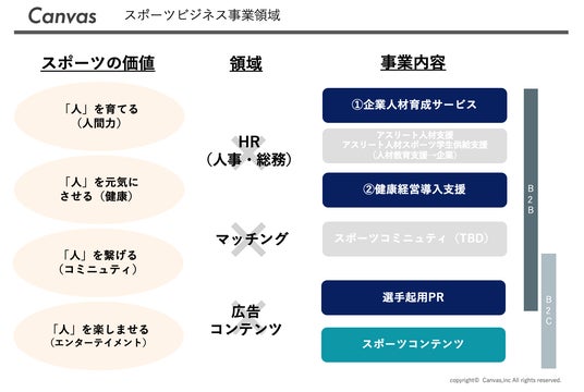 日本におけるスポーツの価値は、競技力だけではなく、ビジネスとしても向上させることが可能と考えています。スポーツが保有するリソースとして、スタジアムやアリーナ、その周辺の地域や施設、またアスリートのフィジカルデータや映像データ、団体の保有する権利など、多くを持ち合わせています。これらのリソースを活用し、スポーツの価値を他産業の価値と掛け合わせることで、スポーツの価値向上に繋がります。スポーツの価値の一つとして、Canvasは「人」に焦点を当て、Canvasがこれまで培ってきた企業の課題解決能力を活かし、第二創業フェーズとして、ビジネス界におけるスポーツの価値を向上させるスポーツビジネスを展開してまいります。