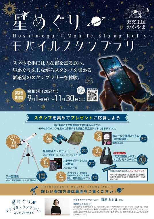 「天文王国おかやま」誘客促進協議会は、岡山県内にある天文関連施設の認知拡大と誘客を図る事を目的とし、2024年9月1日(日)~2024年11月30日(土)の期間、「星めぐりモバイルスタンプラリー」を開催します。