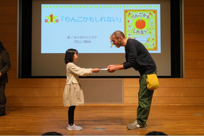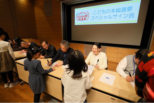 応募総数144,188票から第1位に選ばれた「りんごかもしれない」の表彰時には、作者のヨシタケシンスケさんが投票への感謝と喜びを話しました。また、今回初めて開催した「こどもの本総選挙スペシャルサイン会」では、著者および関係者8名と又吉直樹さんが、子どもたちの持つ色紙にサインやイラストを描きました。参加者は、憧れの作家と話をしたり、大好きな著者の方に書いていただくサインを嬉しそうな表情で受け取っていました。