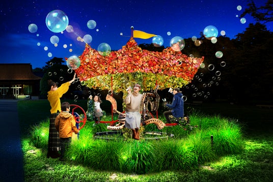 歴史的な建物が並ぶ「江戸東京たてもの園」の存在を意識した、レトロでノスタルジックな気分を演出する、手動のメリーゴーランドです。天井を生い茂るように秋の紅葉や草木でデコレーションされたメリーゴーランドには、美術作家がそれぞれ異なる個性に仕上げた3体の木馬が配されています。期間中は、実際に体験することもできます。