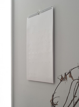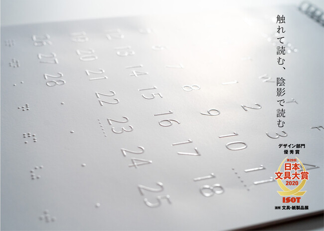 視覚障害のある方、晴眼者の方、点字の読める方、読むことの難しい方。もしも見え方や読む手段の異なる人々が一緒に使うことが出来たなら、自然とお互いの距離が近づき、今よりも気持ちの良い社会が育まれるのではないか。そんな想いから生まれたカレンダーです。視覚障害のある方のなかで点字の読める割合が1割程度であることや、加齢や病気により中途で視覚障害になる方が増加していることを背景に、視覚障害となる以前に目で読んでいた数字のカタチを浮き出すことで、誰もが一緒にお使いいただけます。暦のみに絞った無駄のない機能性と、お部屋に自然と溶け込むシンプルなデザインが特長で、第29回日本文具大賞2020ではデザイン部門の優秀賞を受賞しました。