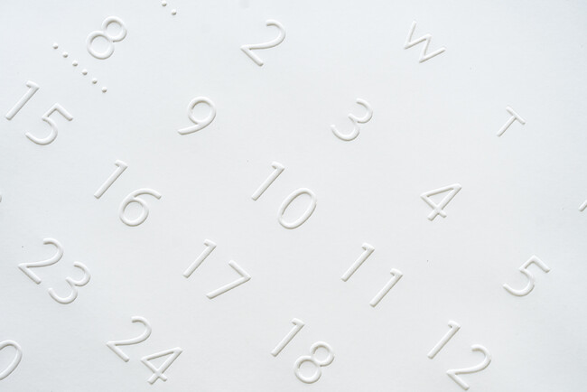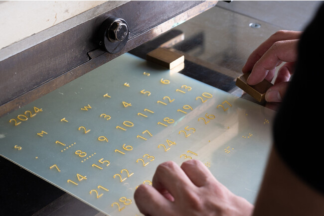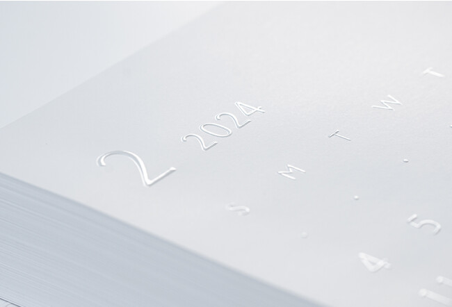 数字や曜日をクリア箔で捺した用紙に、浮き出し加工を施しました。文字に艶やかなクリア箔が加わることにより、これまで以上に優れた視認性と、地の紙質との違いによる触り心地の変化が生まれ、さらなる可読性の向上を実現しました。