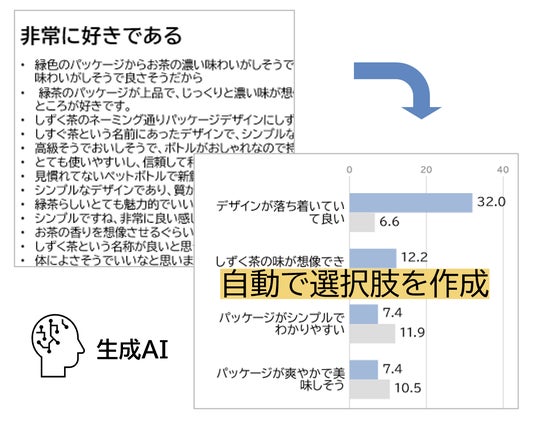 レポート作成やアンケート設定画面でテキスト生成AI(LLM)を活用しています。レポートでは受容性の理由や印象についてのテキスト回答を自動で分類し、グラフ化して出力します。