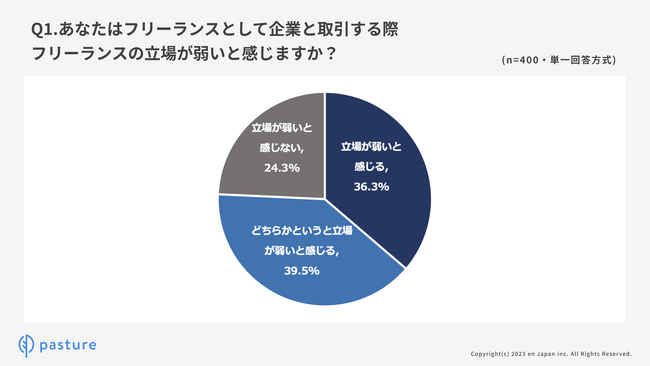 フリーランスとして企業と取引する際、フリーランスの立場が弱いと感じるか質問したところ、75.8%が「立場が弱いと感じる」(立場が弱いと感じる:36.3%、どちらかというと立場が弱いと感じる:39.5%)と回答しました。