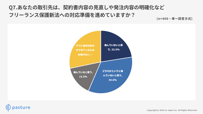 自身の取引先は、契約書内容の見直しや発注内容の明確化などフリーランス保護新法への対応準備を進めているか質問したところ、56.5%が「進んでいないと思う」(進んでいないと思う:22.5%、どちらかというと進んでいないと思う:34.0%)と回答しました。