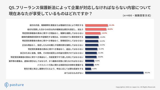 Q5.フリーランス保護新法によって企業が対応しなければならない内容について、現在あなたが享受しているものはどれですか。(n=400・複数回答方式)