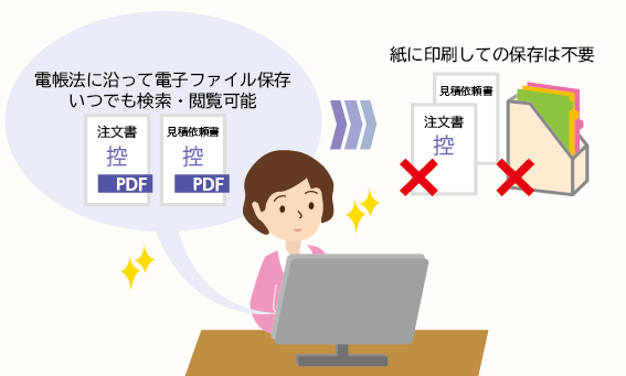 具体的には、見積依頼書(控)と注文書(控)を電子ファイルのまま保管できる機能が、電帳法対応として認証されました。両伝票については楽々ProcurementIIが自動で作成・保管するため、購買担当者は特別な操作をする必要がありません。