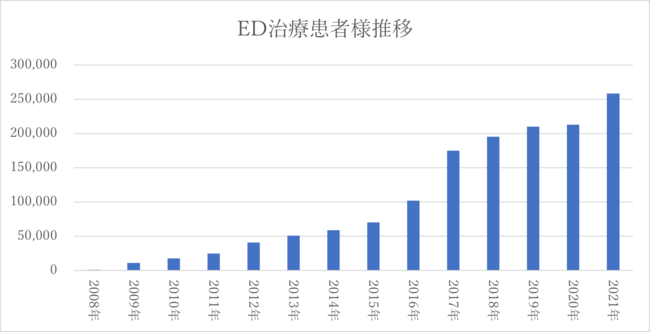イースト駅前クリニックではED治療を行う患者様が2008年の開院してから年々増加しており、21年には月に3万人の患者様にご来院頂き、過去最多の患者様数となりました。