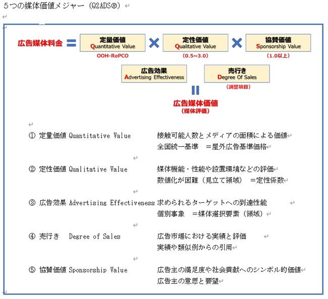 現在、株)ジャオダックでは、屋外・交通広告領域の広告価値定義として、定量価値、定性価値、協賛価値、広告効果、売行きの5つの媒体価値メジャー(Q2ADS(R))を提唱しています。