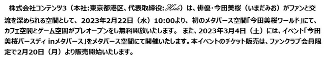 また、2023年3月4日(土)には、メタバースイベント「今田美桜バースディ inメタバース 」を今田美桜ワールド内で開催いたします。ファンクラブ会員限定のチケット発売日は2月20日(月)11:00を予定しております。今田美桜とメタバース空間で交流を楽しめるバースディイベントに、ぜひご参加ください。