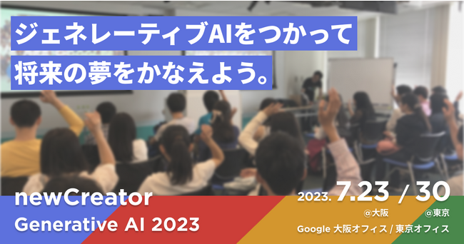 特定非営利活動法人ニュークリエイター・オルグは、高校生がジェネレーティブAIとプロンプトエンジニアリングを用いて未来の夢を探求する無料ワークショップ、「newCreator Generative AI 2023」を2023年7月に大阪と東京で開催します。このイベントではGoogleの社員と一緒に、自身の夢を実現するAIを作るためのワークショップを行います。