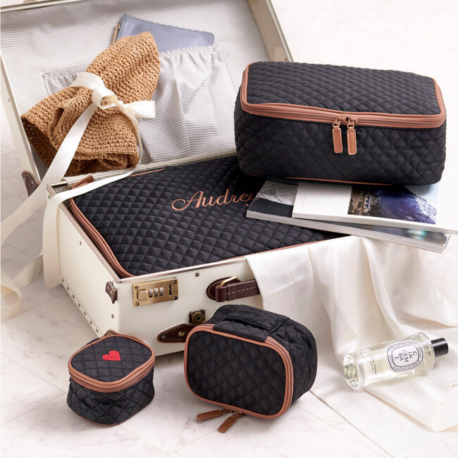 外出先で取り出す際にもパッと目を引く、上品なカラーのキルトポーチ。ブラック、サンド、 ネイビーの3色展開です。オリジナルの刺繍を入れることで、もっと特別に。全サイズ、持ち運びに便利な持ち手付きで、機内持ち込みにも役立ちます。ギフトにも大人気のアイテムです。