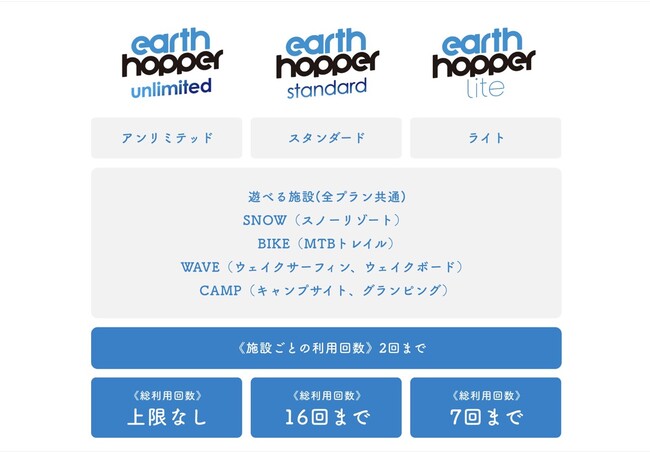 プランごとの違いは最大利用回数のみとなっており、どのプランを選んでもすべての提携施設で遊べます。新たに発売する「アースホッパー ライト」は、旅行・レジャーとしてもワンシーズンで実現しやすい5~6回程度の利用で元が取れ、手軽に始めてみたい人にもぴったりです。スタンダードを購入したけれど足りなくなりそうな人のアップグレード用として、2枚目の購入にもおすすめです。家族や友人を誘うときにも勧めやすく、お友達紹介プログラムの利用でさらにお得にお求めいただけます。