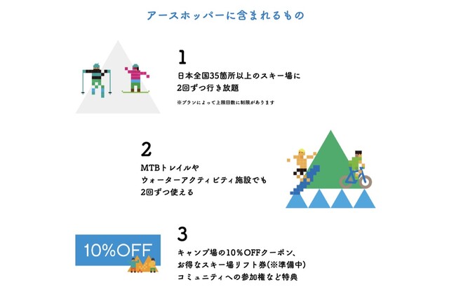 キャンプ場の10%OFFクーポン、お得なスキー場リフト券(※準備中)、コミュニティへの参加権などの特典
