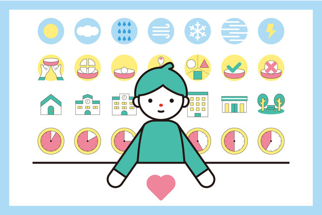 時間 / タイマー / 日付 / 曜日 / 天気 / 場所 / 乗り物 / 持ち物 / 日課