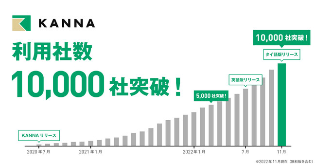 2020年7月に「KANNA」を提供開始して以来、約2年4ヶ月で10,000社を超える企業様にご利用いただくまでに成長しました。また、2022年7月に英語版をリリースし、トライアル利用を含めると10カ国以上の国でKANNAをご利用いただいております。
