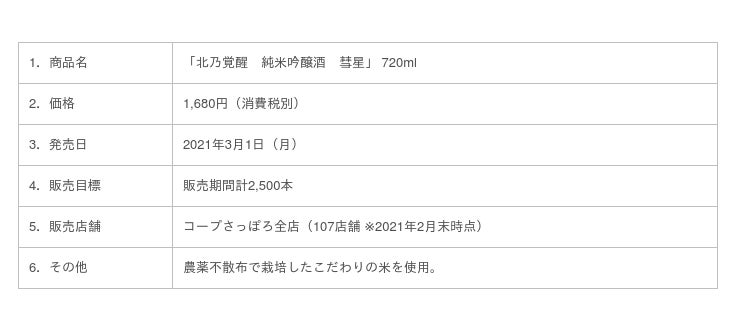 生活協同組合コープさっぽろ(以下、コープさっぽろ)では、「北海道から全国に日本酒文化を覚醒させ、未来をつなぐ応援をしたい」という思いを込め、せたな町・農園おりざにて、北海道の酒造好適米である「彗星」を農薬不使用で栽培、倶知安町・二世古酒造様にて醸造した日本酒「北乃覚醒 純米吟醸酒 彗星」を新発売いたします。