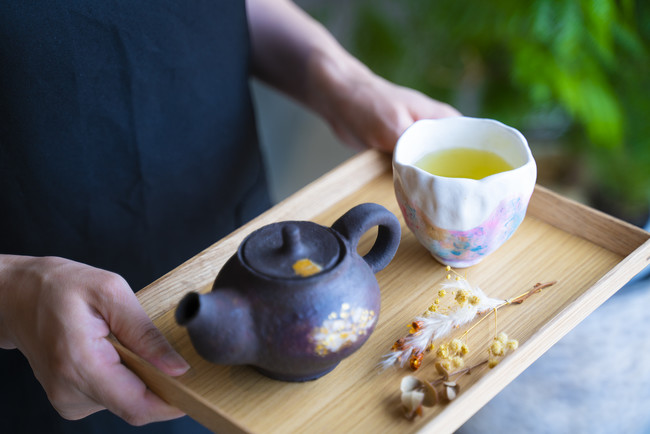 伝統文化を次世代へ伝えていくために、時代に合わせた楽しみ方を提供したいと考え、この度「金沢茶寮」を開業する運びといたしました。また、吉岡氏と松浦氏、それぞれの視点が重なり合い生まれた最先端の「金沢塗」の色彩は、江戸時代から続く「金沢塗」特有の漆による色彩ではなく、陶器に色鮮やかな10種類以上の塗料を重ね塗り、削り、感性を研ぎ澄ましながら器を描く技法となります。