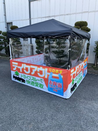 地方がこの流れに乗る為には ドライブスルーでのテイクアウト販売が必要です。簡単に設置できるドライブスルーコーナー(タープテント式)で 新たな販売チャネルを構築して下さい。