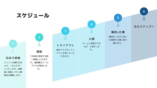 今後、より海外で挑戦したいという前のめりな方を応援するために、サッカーでの海外留学を支援しているユーロプラスと業務提携を行ない、金銭的な面からチーム探しまで、包括的な支援を実施していきます。