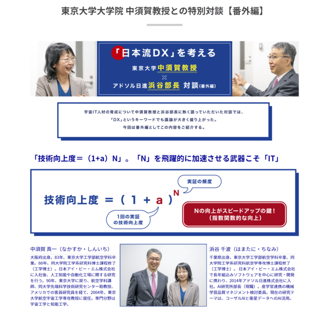 このたび、本共同研究の経緯や狙い、東京大学大学院工学系研究科で開講した新講座「実践宇宙データ活用」における取り組み等について、東京大学大学院工学系研究科・中須賀真一教授と当社AI研究所部長・浜谷千波が対談を行い、この記事の【番外編】を公開いたしましたので、お知らせいたします。