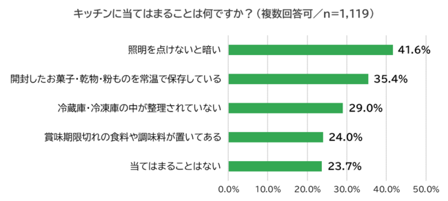 次の項目でキッチンに当てはまることは何か尋ねたところ、4割超が「照明を点けないと暗い」(41.6%)と回答。「開封したお菓子・乾物・粉ものを常温で保存している」(35.4%)、「冷蔵庫・冷凍庫の中が整理されていない」(29.0%)、「賞味期限切れの食材や調味料が置いてある」(24.0%)と続きました。