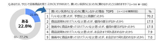 また、同調査内で「サロンで商品を買いたい気持ちになったが結果的に購入しなかった理由」として は、単純に「予想以上に高額だった」と価格理由がメインではあるものの、それ以外の「購入の可能性 があった」にも関わらず購入しなかった理由として ・商品説明をされて「いいな」と感じたが値段の提示がなかったから ・商品説明をされて、または商品を使って「いいな」と感じたがお会計まで案内がなかったから などコミュニケーション不足による離脱が全体の約30%にのぼることがわかります。