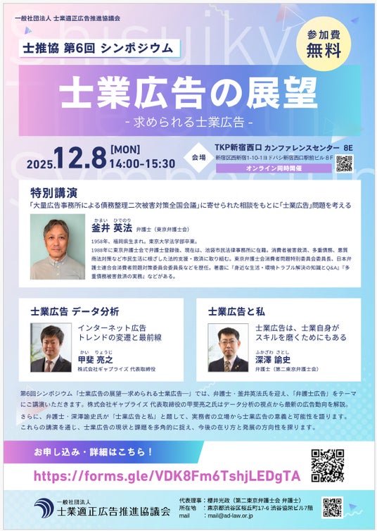 士業の広告に関する環境は日々変化しており、適正かつ効果的な広告の在り方が問われています。第6回となる本シンポジウムでは、「求められる士業広告」をテーマに、弁護士・釜井英法氏による特別講演をはじめ、広告データの専門家・甲斐亮之氏による分析、さらに弁護士・深澤論史氏による実務者からの視点を交え、士業広告の現状や課題と今後の展望を多角的に考察します。