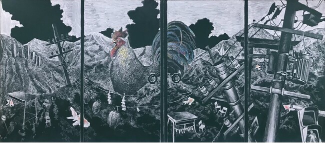 黒板の地色と白チョークを中心にモノトーンに近い描写の中で、色を差した鶏のとさかが目を引きます。白色のチョークの使い方を工夫し、特に鶏の首から胸にかけての描写が秀一です。画面に配置された電柱や建物、机や椅子などの人工物は、山頂の旗を除き決してまっすぐ立つことはなく、その空間を泳ごうとしている金魚、そして鶏。命ある生き物に宿る意志がまるで彼らの心情を物語っているようです。電線は異なる世界をつなぐ象徴なのか、電線に結ばれた御幣は不浄と神聖の境目なのか。だとすると画面奥が神聖な世界なのでしょうか。机の脚にも注連縄が結ばれ、画面全体が襖絵として描かれています。襖を開いたその先には何があるのでしょう。多くの暗示を含み、今の閉塞感や不安に立ち向かおうとしている高校生の静かなそして強い意志が、山頂に向かう小さな人間にも感じられます。