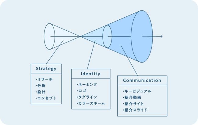 ブランドコンセプトを導きだすための戦略構築、ネーミング・ロゴ・タグライン・カラースキームといったアイデンティティ策定、キービジュアル・紹介動画・紹介サイト・紹介スライドといったコミュニケーション制作までを包括的に支援します。