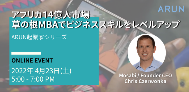 本イベントでは、クリス・チェルウォンカCEOより、モサビのこれまでの歩みや現況をご報告いただくほか、ARUN Seed代表功能とのトークセッション、皆さまの学びを深めていただくブレイクアウトセッション、Q&Aセッションなどを予定しております。