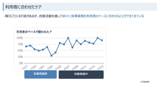 当法人では業務効率化と生産性向上を目的に法人全体で2021年より介護ロボット・ICTを積極的に導入し実践しておりましたが、モニタリングの機会が少ないと感じておりました。今回の伴走支援では、現状使用している介護ロボット・ICTなどのテクノロジーの活用を図るために、業務アドバイザーのTRAPE様と相談し、一度立ち止まり現場の課題をアンケートし洗い出してからスタートしました。可視化された課題の絞り込みと優先順位をつけ、法人が取り組むべきテーマを全職員で対話して決定し「情報共有システム」を活用するためのアクションプランを立案し実践しました。推進のポイントは、誰が・いつ・どこで使うかを、現場のオペレーションに合わせて「仕組化」し「教育」をしていくこと。テクノロジーを活用するのも「人」 です。TRAPE様の伴走支援があり、プロジェクトメンバーは限られた時間の中でも、素直に前向きな姿勢で取り組み出来たことも1つの成果だと感じております。今後も、伴走支援プロセスでの学びや貴重な経験を活かし、介護事業のDX推進を図りたいです。