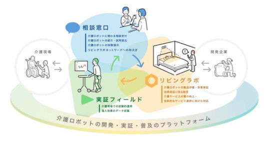 この事業は、地域における相談窓口の設置、介護ロボットの評価・効果検証を実施するリビングラボ(開発の促進機関)を含む関係機関のネットワークの形成、実証フィールドの整備などを行うことで、全国版プラットフォームを構築し、介護ロボットの開発・実証・普及の流れを加速化することを目指しています。