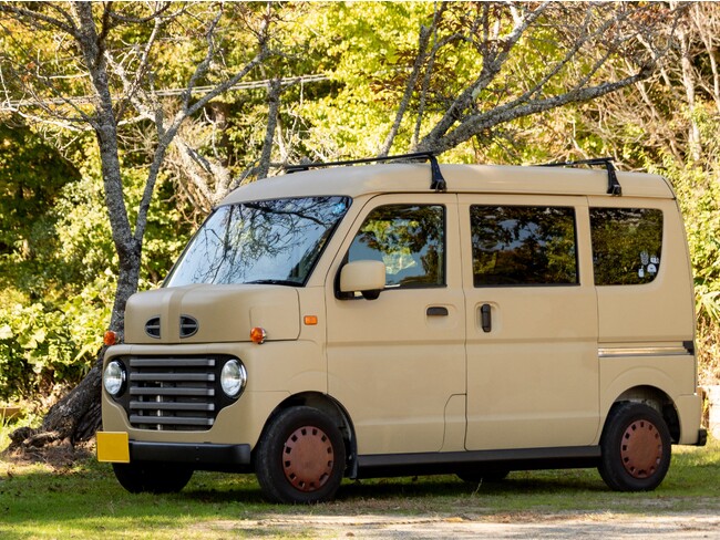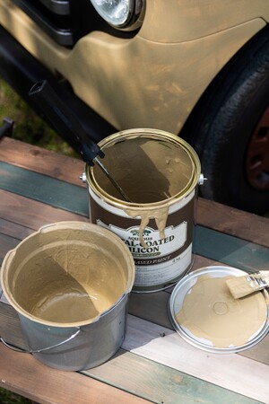 「刷毛塗り全塗装セット」を使って刷毛とローラーでDIY全塗装されたデモカーを展示。「刷毛塗り全塗装セット」とは、車用DIY全塗装専用のつや消し塗料。ムラが目立ちにくい塗料なので、刷毛とローラーでご自宅で簡単に車を全塗装できます。軽トラ1台を塗料と道具込みで2万円前後で塗装することが可能。公式通販サイト「刷毛(ハケ)・ローラーで車をDIYで全塗装しよう!」:https://brush-carpaint.com/