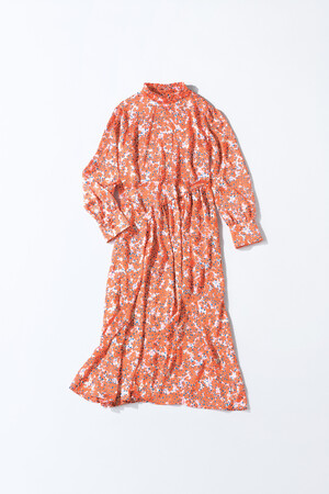オリジナルプリントが華やかなワンピースは、アシメトリーに入れたローウエストの切替で美しいシルエットに。アウターには黒のボアコートをチョイス。サイドゴアブーツとプレイフルな着こなしに。