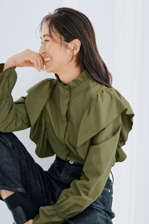 Q.シックなカーキ色とフリルのバランスが魅力のブラウスですが