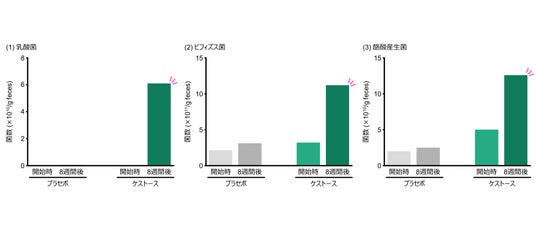 ケストースまたはプラセボの摂取開始前および摂取開始から8週間後において糞便を採取し、糞便中に含まれる有用菌(乳酸菌、ビフィズス菌、酪酸産生菌)の菌数を測定しました。