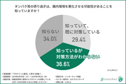 次に、「タンパク質の摂り過ぎは、腸内環境を悪化させる可能性があることを知っていますか?」と質問したところ、約4割の方が『知っているが対策方法がわからない(36.6%)』と回答しました。