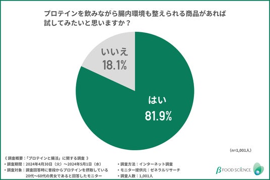 最後に、「プロテインを飲みながら腸内環境も整えられる商品があれば試してみたいと思いますか?」と質問したところ、約8割の方が『はい(81.9%)』と回答しました。