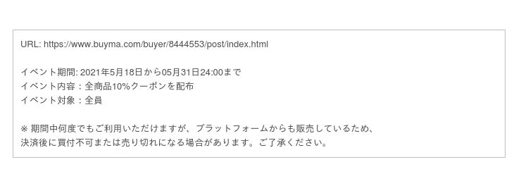 全ての商品が更に10%オフ!2週間だけ行う期間限定の記念セールを是非見逃さないでください。