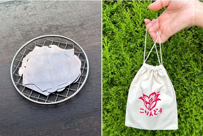 こりんどうは、突起や曲げの無い板8枚と焼き網で構成されています。全部重ねると、板だけで4mmと極薄にすることができます。これらが専用の巾着袋の中にすっぽりと収まります。