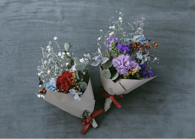 花犀代表の松本亨は「花を一輪も無駄にしたくないという想いと、花植物の可能性を追い求める情熱。常日頃から抱いているそれらの想いを、捨てられる運命にある花々を使って小さな小さなブーケにする事で表現しました。お母様へ、日頃の感謝の気持ちを花束に込めて、お届けできればと願いを込めて。」とコメント。